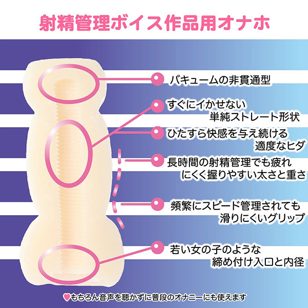 ストーリー性のある射精管理ボイスにより、触覚だけでなく聴覚からも感じることができます!気になるオナホはバキュームタイプの非貫通型♪すぐにはイケない単純ストレート形状とひたすら快感を与え続ける適度なヒダ、頻繁なスピード管理でも滑りにくいグリップと、握りやすいホール外観の太さと重さも良いですね!まるで若い女の子のようなホール入口と締め付けも新鮮♪オナホ単体としても、奥までビッシリと配置された細かなヒダと裏筋によるヒダ名器がたまりません。 もちろん音声を聴かずに普通のオナホとしてもお楽しみ頂けますよ! ¥1980(販売価格¥3289)