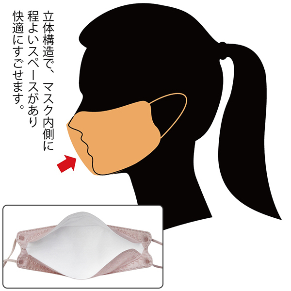 風邪・花粉・ウイルス対策に♪四層不織布立体マスク(アプリコット)の30枚入りです!大人用の普通サイズで高性能四層不織布立体マスク!微小粒子飛沫捕集率(ろ過)効果(PFE)99%。