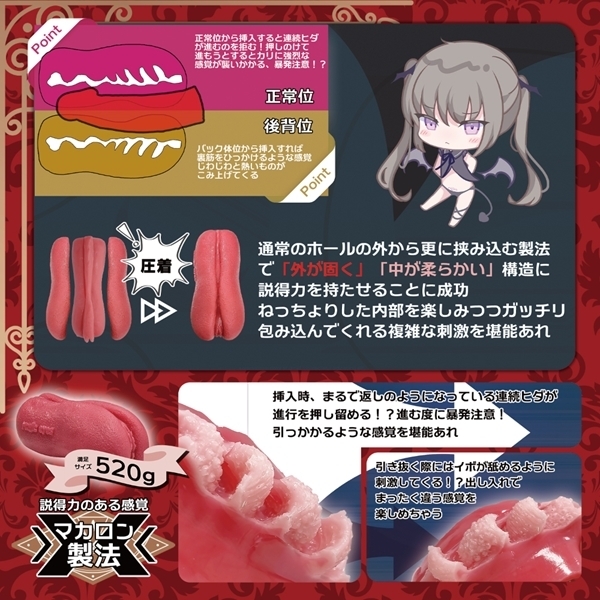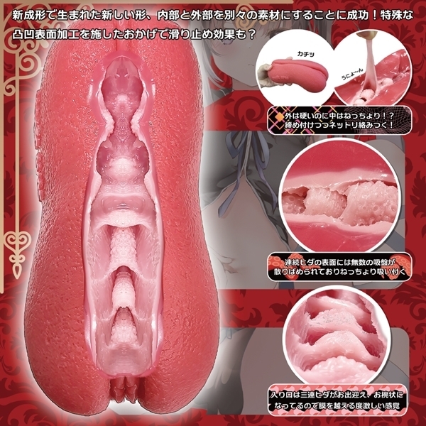 内側と外側が別々のパーツで成形された「マカロン製法」だからこそ実現した使用感が新鮮です!中はフワフワだけど外はしっかりとしたハードカバータイプ。 内部には粘膜層もあり3種の素材で構成されています♪大きな三連返しヒダと細かなイボは上下を逆転させる事で全く異なる使用感!520gの大型ボディの素材には厚生労働省、食品衛生法第370号に準拠した「Magiceyes Skin」を採用しているので安心してご使用頂けます。 ローション付属 ¥2370(販売価格¥4620)