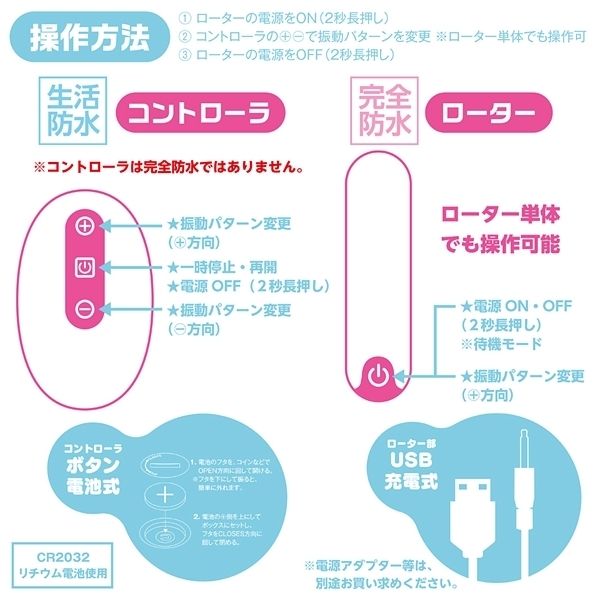 振動機能はリモコン式でボタン電池CR2032が1枚(動作確認用)付属。 ¥1590(販売価格¥OPEN)