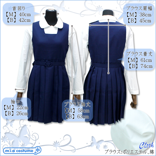 Mサイズ:B〜88cm・W〜76cm ブラウス(着丈61cm・肩幅38cm・袖丈58cm・袖口22cm・首回り40cm) ジャケット(着丈52cm・肩幅41cm・袖丈54cm) ジャンパースカート(総丈87cm)