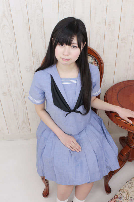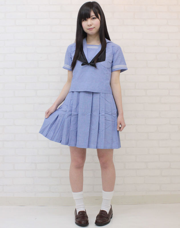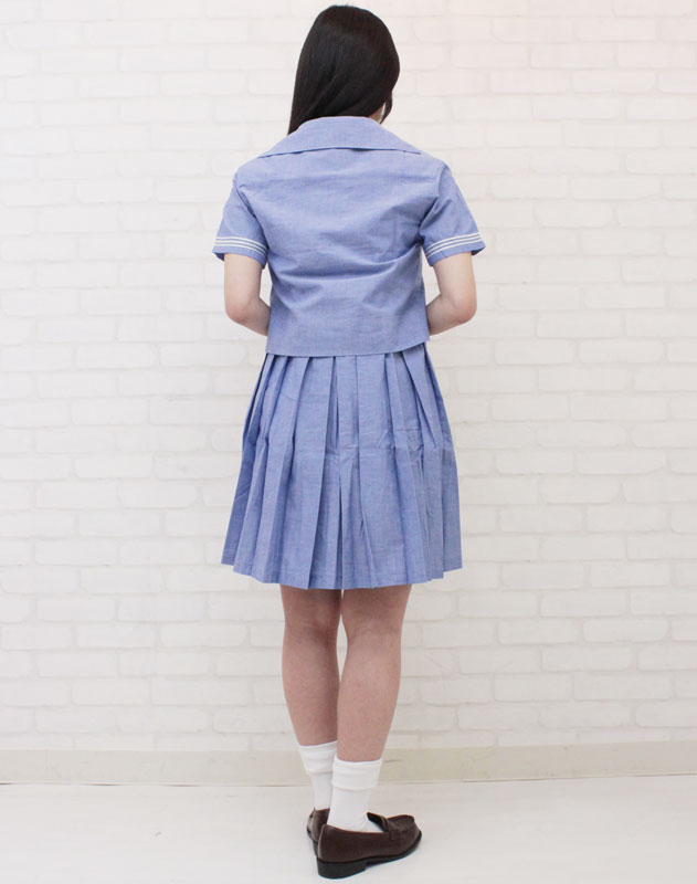 ブルーカラーが爽やか!珍しいジャンパースカートタイプの夏服セーラー服(M)。