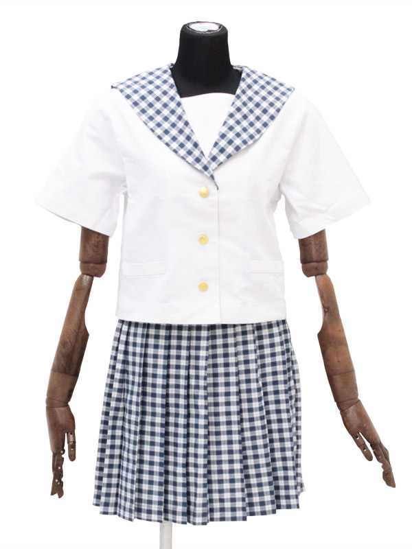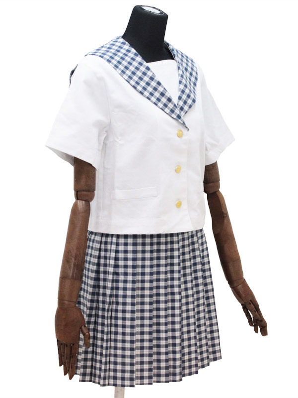 ●真っ白なブラウスに映える蝶デザイン入り金ボタン●細かなチェック柄で夏らしく清涼感たっぷり●襟とお揃い柄のスカートでエレガントな統一感。 暑い日差しの中でもクールに着こなせちゃいそう!お嬢様のような清楚な雰囲気が漂う夏用制服です。 ※水洗い不可、塩素系漂白剤による漂白不可、アイロンは中温で当て布使用、ドライクリーニング可、色落ちの可能性があります、ご注意ください。 ※こちらの商品は在庫の状況により、お届けまでに4日〜7日程度かかる場合がございます。 ¥7800(販売価格¥46750)