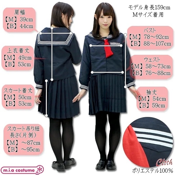 紺地に赤色はとっても映えます!シンプルなセーラー服ですが、吊りスカートがセットになっている本格派♪つくりはかなりしっかりとしているので本物と区別がつかないくらいのクオリティの高さです☆もちろん上下セットでお買い求めいただけます。 ※水洗い不可、塩素系漂白剤による漂白不可、アイロンは中温で当て布使用、ドライクリーニング可、色落ちの可能性がありますのでご注意ください。 ¥6560(販売価格¥38280)