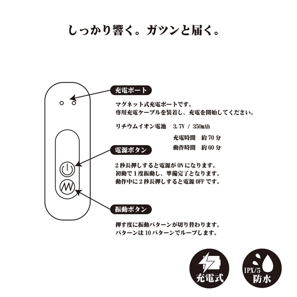 しっかり奥まで届く強振動モーターが先端下部と最下部に搭載されているので、より欲しい快感部位に届くように設計されています。 IPX5準拠の防水性能をもっており、丸洗いもOKな作りです。 全体がしなやかな柔軟性を持っているので、体勢の変化やアナル、そして女性にも効果的にご使用いただけます。 充電式なので面倒な電池交換も無く、ランニングコストも安心です。 強力な快感開発バイブとしてお楽しみください。 ¥2720(販売価格¥5115)