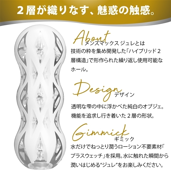 カラットピラミッド(プラスウェッチ層)光り輝く大粒のダイヤの様なギミックが攻め立てる。 【メンズマックスジュレとは】技術の粋を集め開発した「ハイブリット2層構造」で作られた繰り返し使用可能なホール。 【デザイン】透明な雫の中に浮かべた純白のオブジェ。 機能を追求し行き着いた2層の形状。 【ギミック】水だけでねっとり潤うローション不要素材「プラスウェッチ」を採用。 水に触れた瞬間から潤いはじめるジュレをお楽しみください。 【新開発のハイブリッド2層構造】内側と外側が分かれた単純な2層構造ではなく2層のどちらも軟性樹脂が露出する。 それぞれの性能がとろけるように絡みあい楽しめるハイブリッド2層構造を新開発。 【プラスウェッチ層】水だけでねっとり潤うローション不要素材。 温水を使用すればホットプレイも簡単。 【クリスタルゲル層】外側を覆いながら内側まで露出するどこまでも透き通るクリスタルゲル層。 【乾燥スタンド】ジュレの容器は水切りしやすい構造になっており、そのまま乾燥スタンドとしてお使い頂けます。 洗い終わったジュレをタオルなどでよく拭き、乾燥スタンドに設置してください。 【繰り返し使用可能】使用後は水・またはぬるま湯で洗い流してください。 洗い終わったあとは付属の乾燥スタンドに設置し、直射日光や高温を避け、風通しの良い場所に保管してください。 ¥3140(販売価格¥5478)