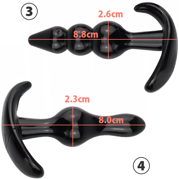 アナル用に開発された拡張プラグが4種類♪それぞれが段階別に用意されているので、ステップアップしながらアナル開発が楽しめます!独自性の高いコブ形状やフォルム、太さと拡張用に最適な4種類。 アナル初心者でも気負いなく挑戦できるものから、開発が進んで普通のモノでは満足出来ないマニアの方にまで安心してお楽しみいただけます♪素材はお尻に優しいシリコン製。 適度なハリと弾力を備え、アナルプレイには欠かせない形状となってますのでアナル素人はもちろん、アナニーに夢中の上級者まで幅広いユーザーにお楽しみいただけます♪。 【本体サイズ】@全長:11.8×3.6cmA全長10.9×最大幅2.6cm。 B全長8.8×最大径2.2cm。 C全長8.0×最大径2.3cm。 ¥580(販売価格¥2300)
