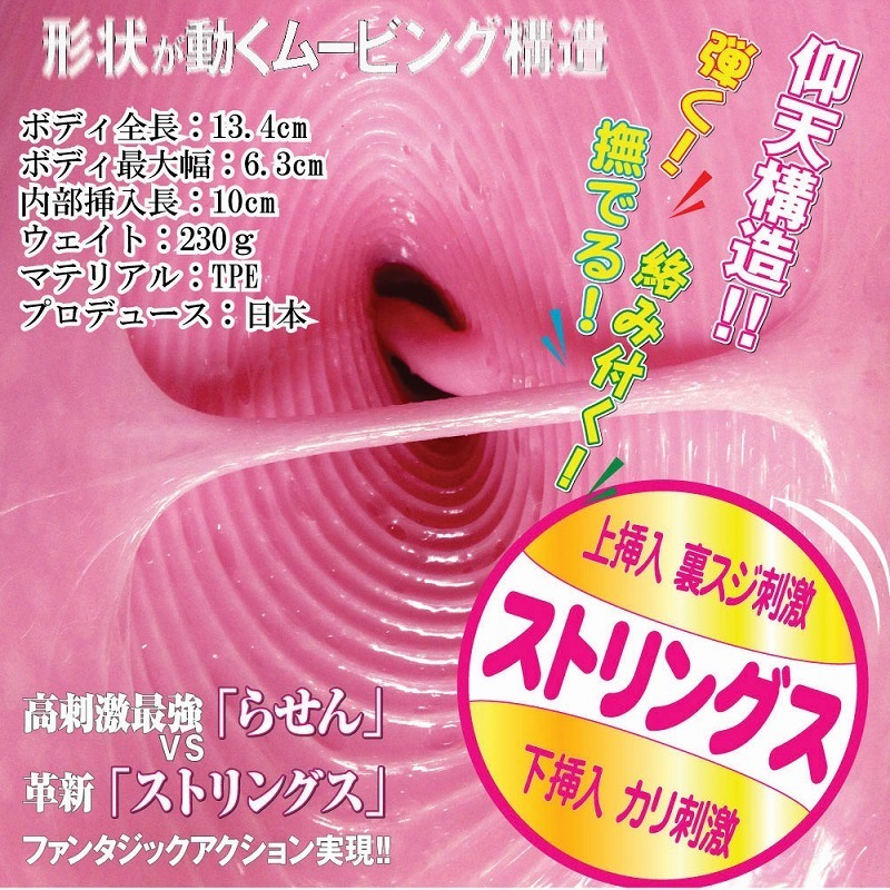 形状が動くというムービング構造には、3本のストリングスを使用!内部はヒダとストリングスで出来ていて、挿入時とストローク中に引っかかり気持ちいい!ヒダと素材の相性は抜群で、ゾリゾリ感と絡みつきが病み付きに!ふわふわモチモチ素材で、べた付きや臭いも気になりません。 絡み付く、弾く、撫でる、3つの効果が一度に楽しめるオナホールです。 ¥860(販売価格¥2090)