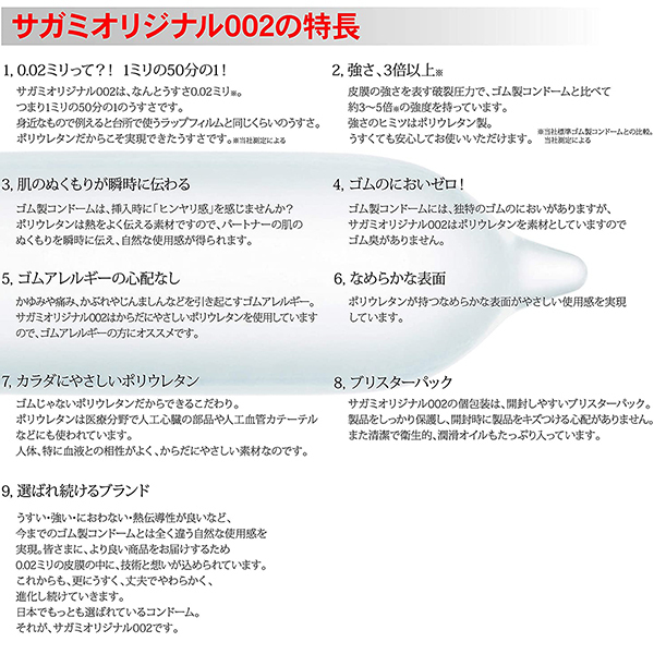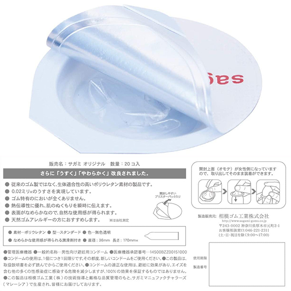 驚きのうすさ0.02ミリ!ゴムじゃないコンドーム「サガミオリジナル002」20個入り。