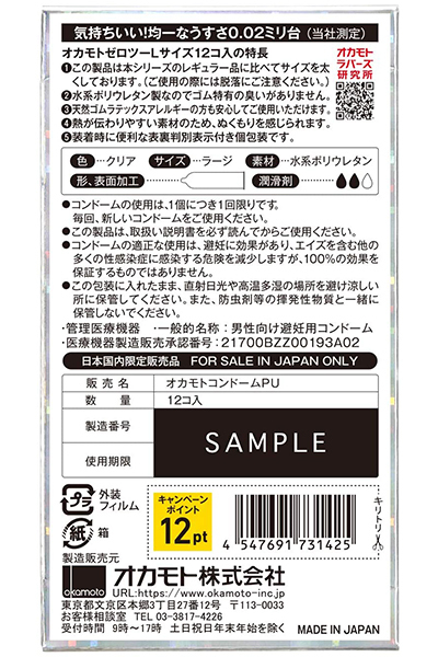 HOME> コンドーム > サイズ(小・大) > オカモトゼロツー うすさ均一0.02 Lサイズ(12個入り) オカモトゼロツー うすさ均一0.02 Lサイズ(12個入り) 商品番号:u00314