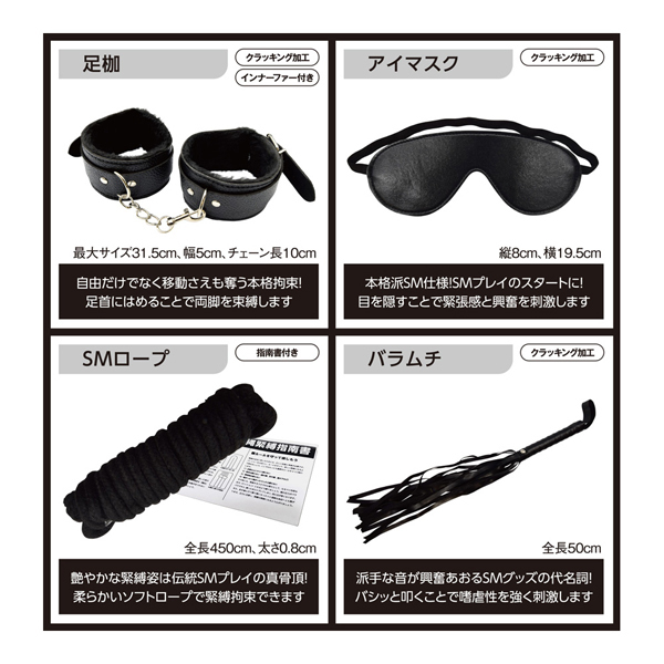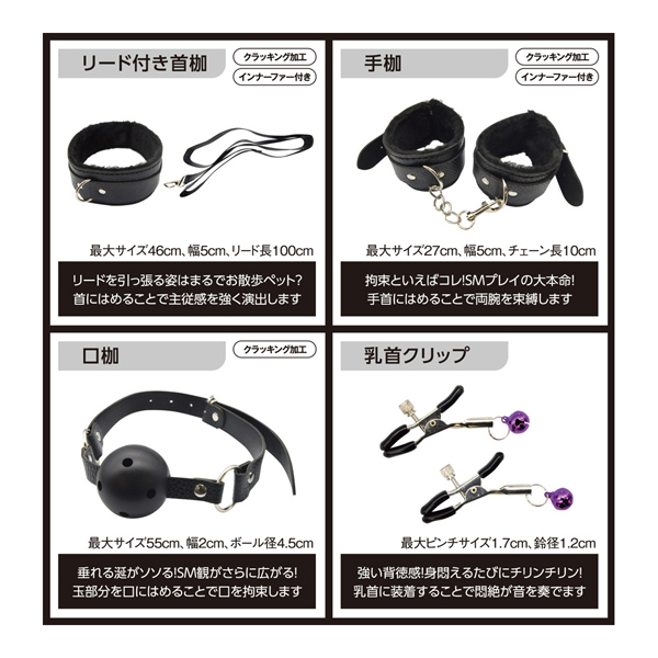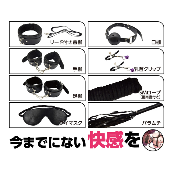 セット内容:リード付き首輪、手枷、足枷、アイマスク、口枷、乳首クリップ(2個)、SMロープ、SMロープ用指南書、バラムチ