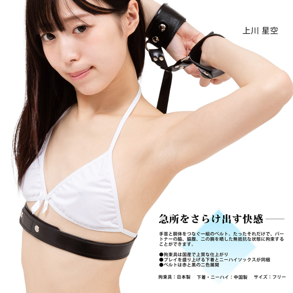 手首と胴体を一組のベルトで繋ぎ止め、ワキだけでなく、わき腹や二の腕までを晒し無抵抗な状態で動きを制限!ベルトは高品質な日本製で、手軽に使えるマジックテープ式♪他にもブラ、紐パン、ニーハイ付属!パッケージの元AV女優「上川星空」さんと同じように完成します。 Fサイズ、ブラック ¥3860(販売価格¥OPEN)