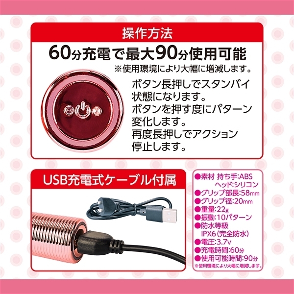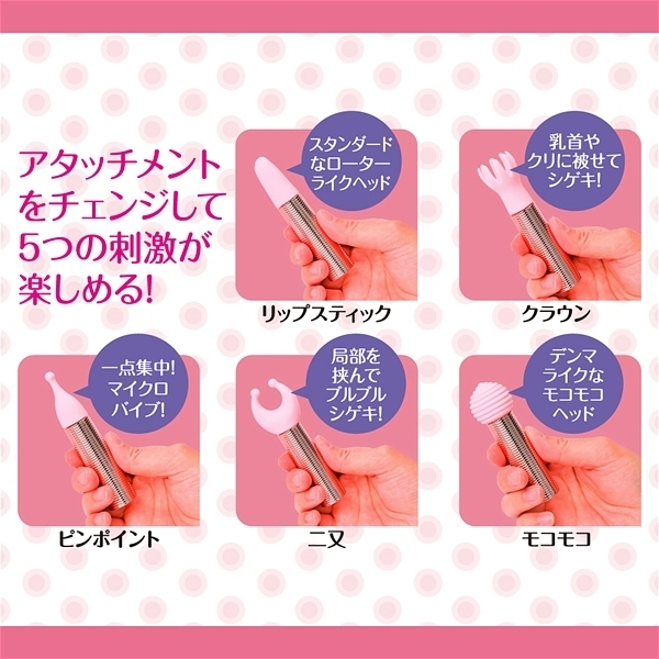 滑らかなシリコンヘッドはローターライクな使い方が楽しめるリップスティックタイプと乳首等を挟んで刺激出来るクラウンタイプ、一点刺激が楽しめるピンポイントタイプ、局部を挟んで刺激する二又タイプ、デンマライクに楽しめるモコモコタイプの5種類。 3.7Vのハイパワーリチャーブルバッテリー搭載。 60分充電で90分の使用が可能です(使用環境により大幅に増減します)。 IPX6の防水性能だからしっかり洗えて水場でも遊べます。 振動パターンは10種で色々な振動が楽しめます。 ¥3520(販売価格¥5478)